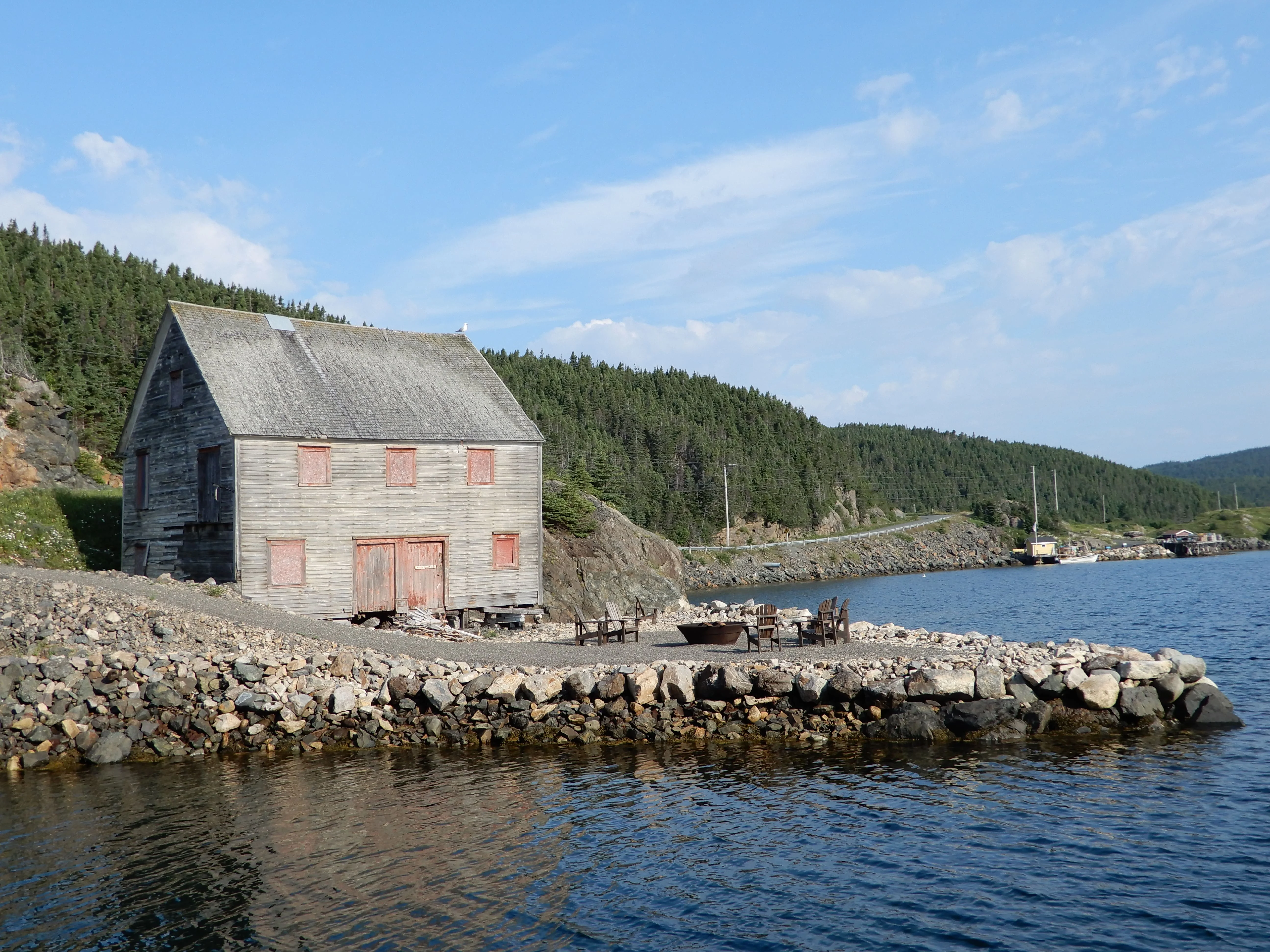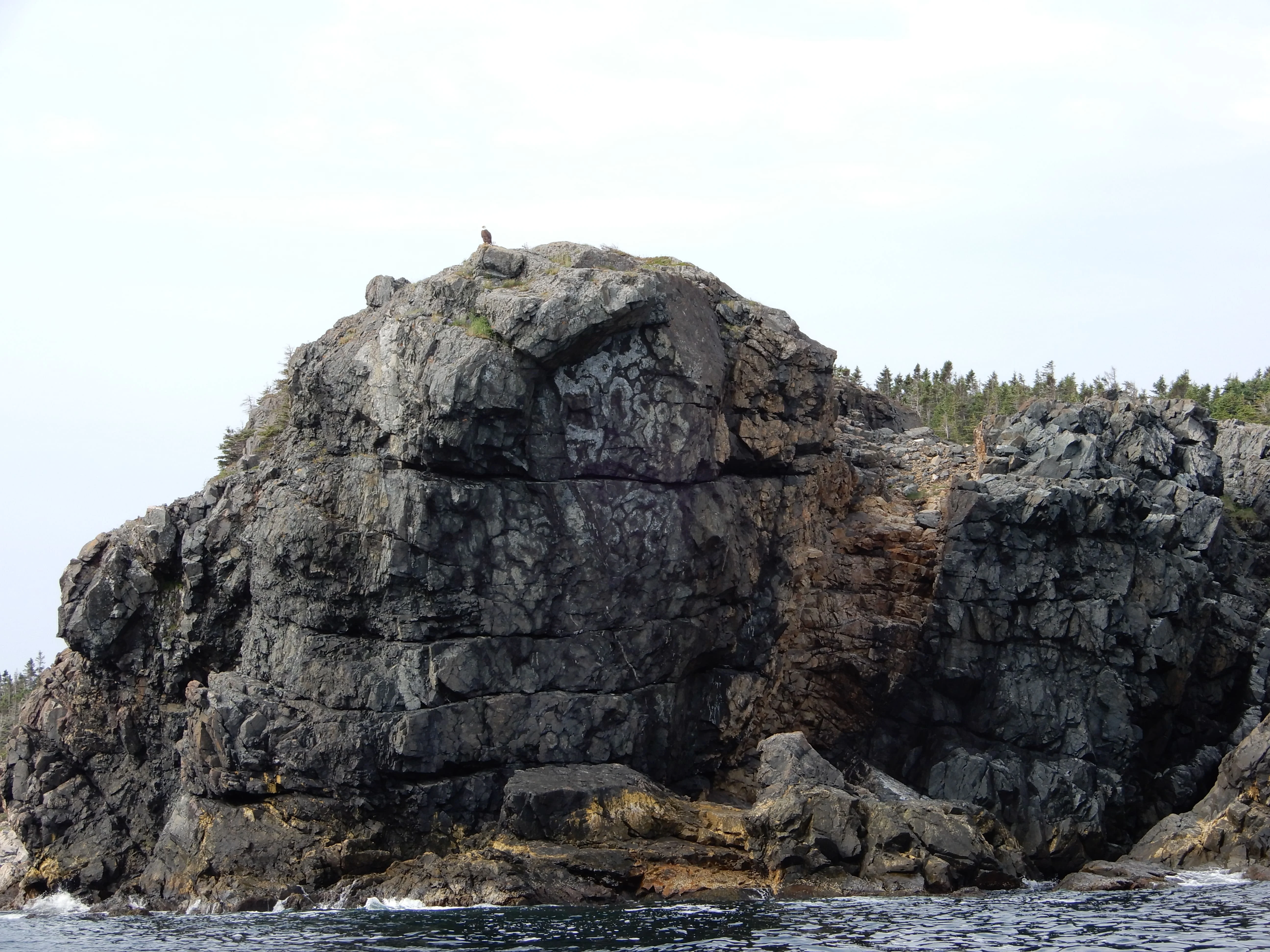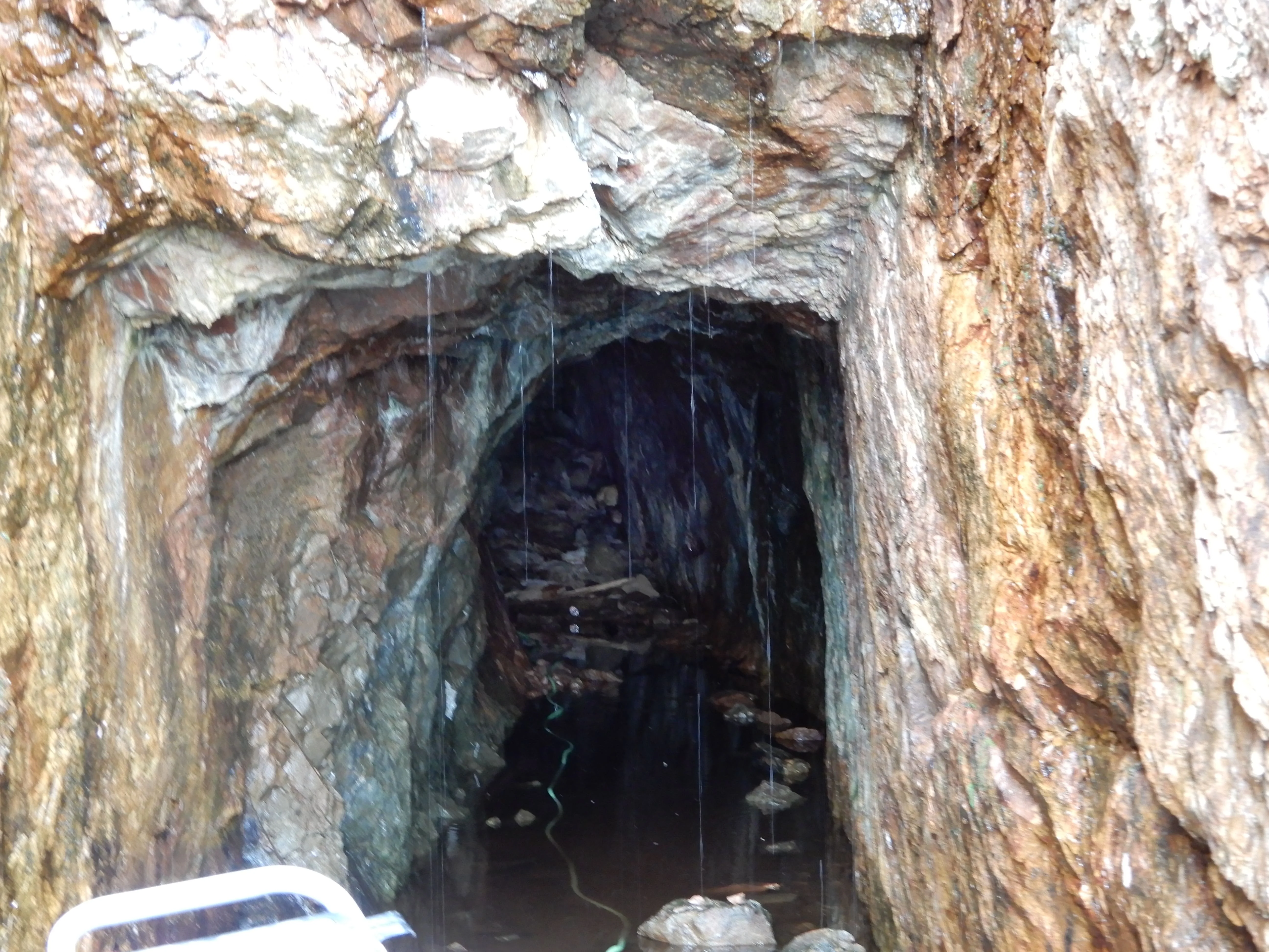 Frost Cove Antimony Mine on the Black Raven Property withthe lower adit clearly visible above the beach